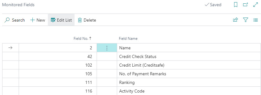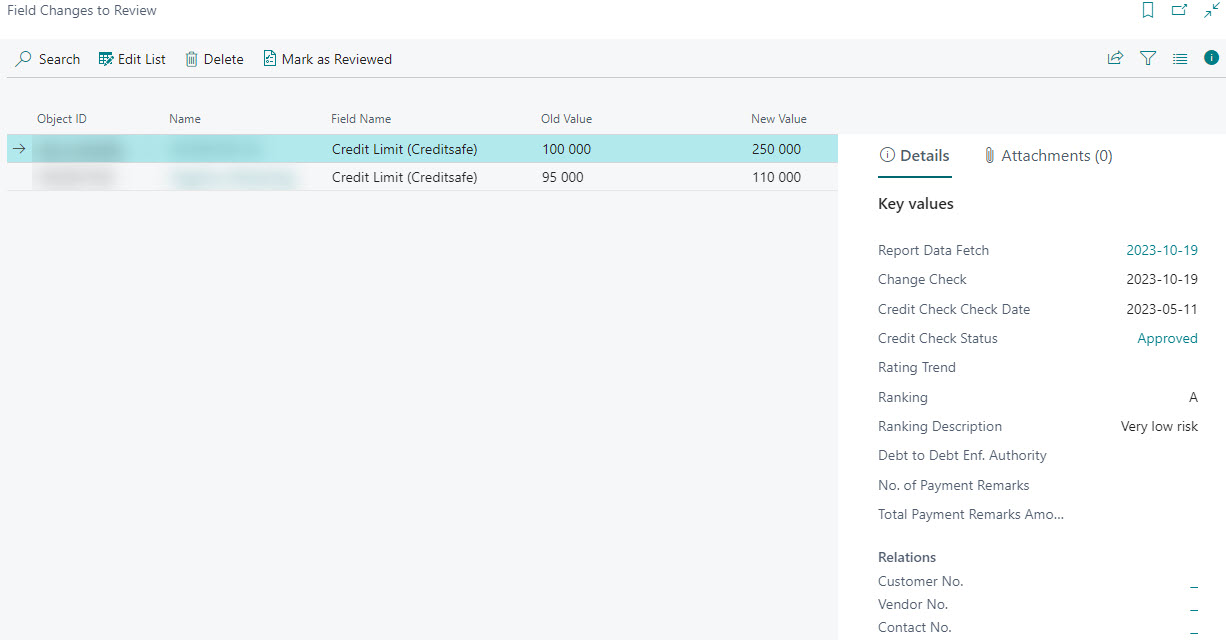 When new data is fetched from Creditsafe, and a value of a monitored field is changed, that change is logged in the list of field changes where they can be marked as reviewed.