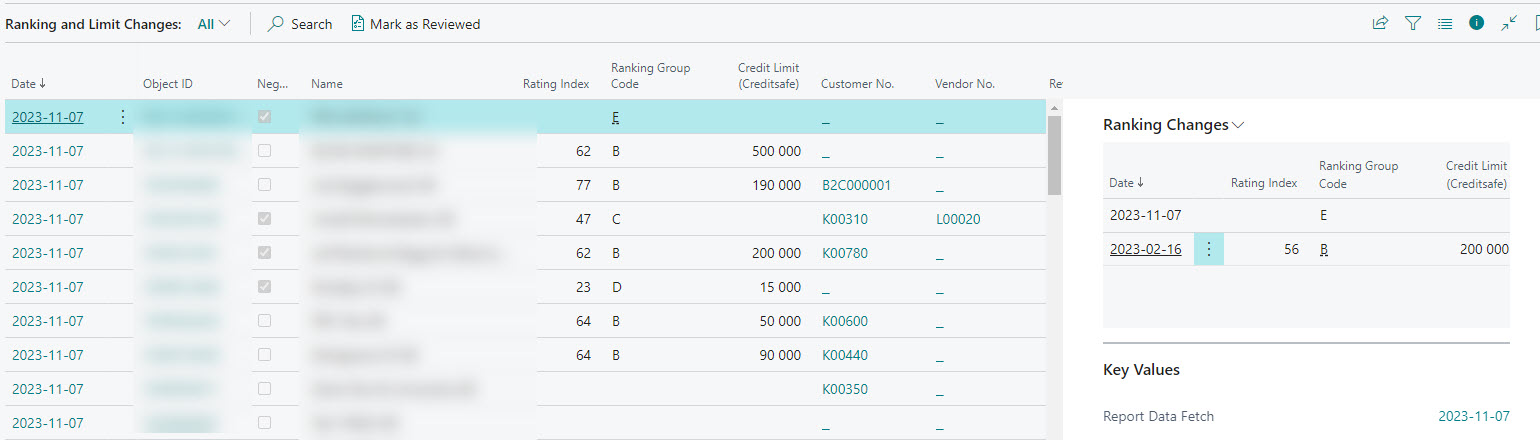 The Rating/Limit Changes list tracks all changes to rating, ranking and credit limit. In the factbox you can see all ranking changes over time and details about the monitoring object and any linked customer and/or vendor. Records that contain any kind of negative information is marked as negative and there are predefined fields for easy filtering of negative ranking, rating and credit limit.