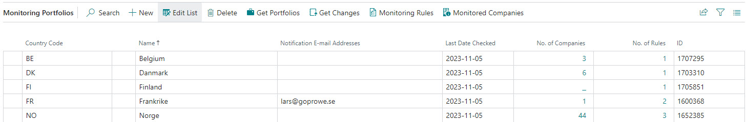 Monitoring portfolios are used to discover when changes occur on company data in Creditsafe. The portfolios are setup with rules that tell Creditsafe which kind of changes the portfolio shall react on. Based on portfolio changes, new report data and credit checks can be automatied in Business Central.
