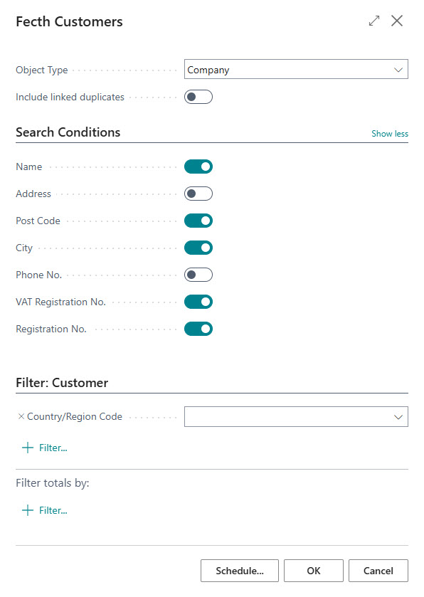 The checkboxes on the tab "Search Conditions" decide what data to bring from the customer card to the batch search line. If VAT registration number or registration number exists on the customer either one of these number will be used for searching.